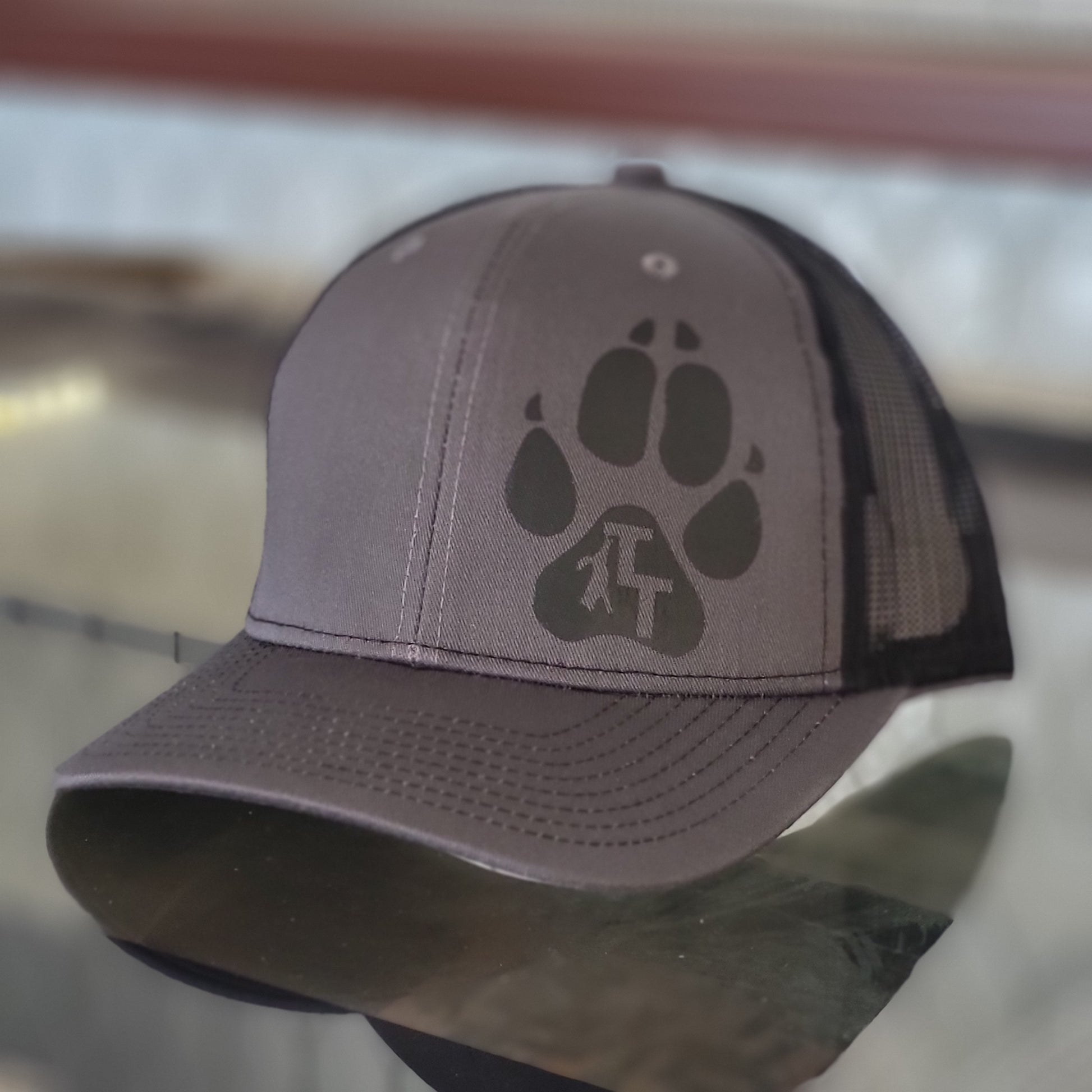 A mid-profile hat in charcoal/black with black screen print TT track logo.